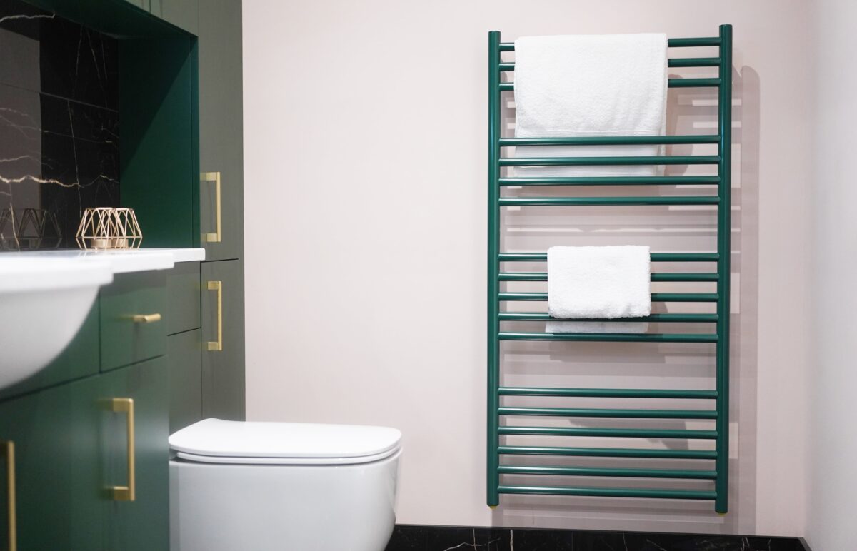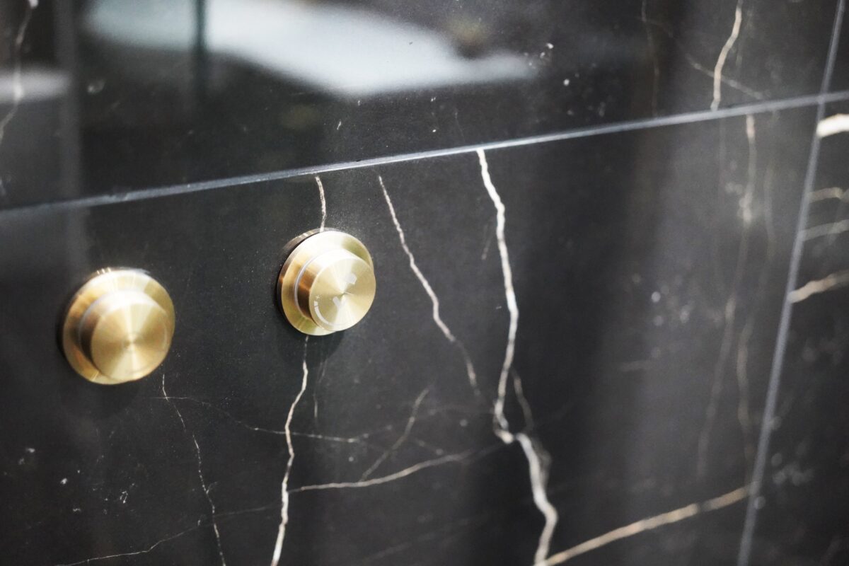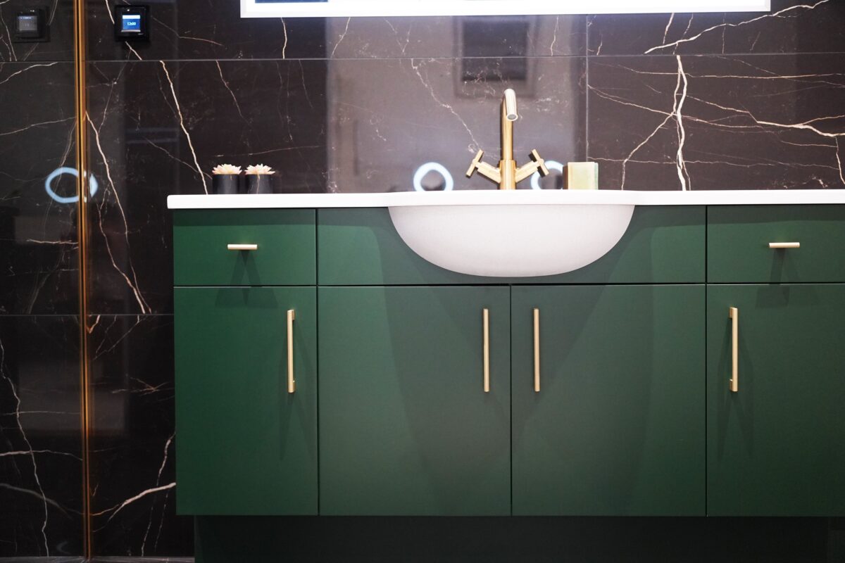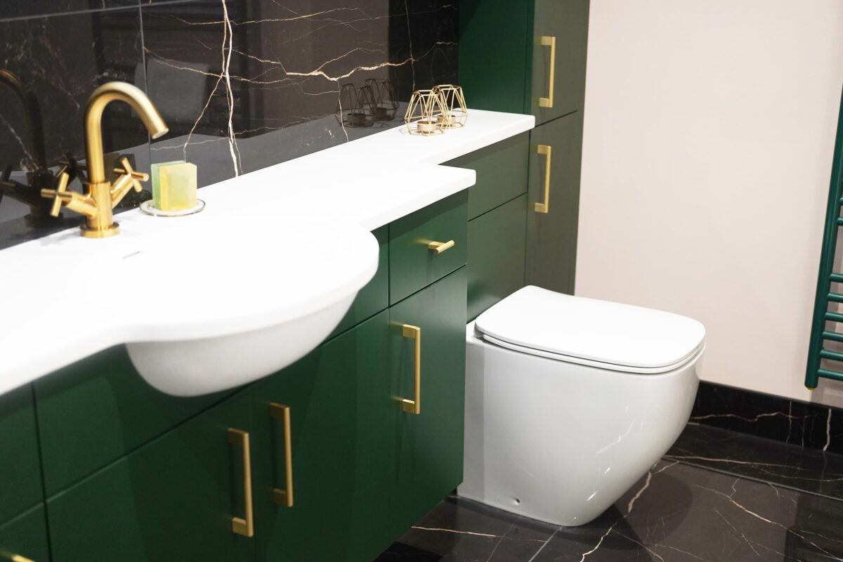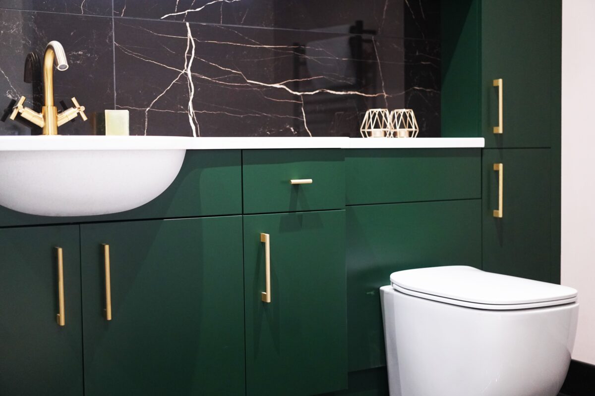 This bathroom project combines deep, luxurious tones with refined metallic finishes to create a bold yet sophisticated setting. The design features striking black marble-effect wall tiles with delicate white veining, paired with rich green cabinetry and brushed brass accents. The result is a space that feels both opulent and modern, balancing strong visual contrasts with clean-lined simplicity.