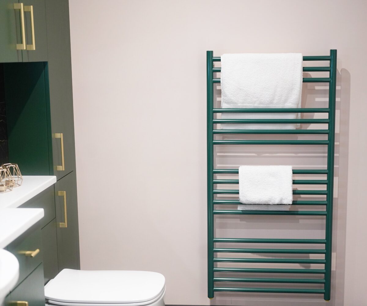 The shower area is framed in brass trim, complementing the black marble backdrop and enhancing the room’s luxurious feel. A matching green heated towel rail provides both practicality and design continuity, echoing the cabinetry colour for a unified aesthetic. Every detail—from the precision-aligned handles to the subtle gold drain cover—has been carefully considered to ensure a cohesive, high-impact finish.
