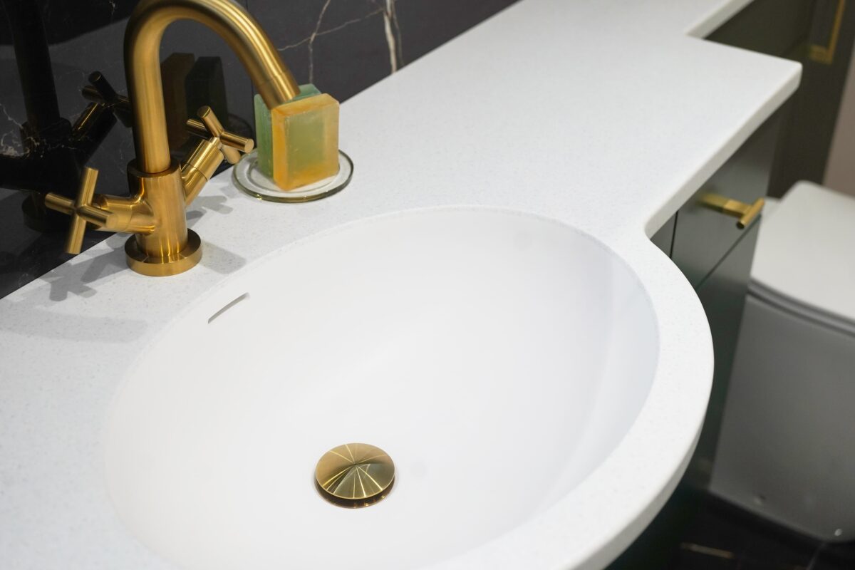 At the heart of the scheme is a run of bespoke green cabinetry topped with crisp white surfaces. Brushed brass handles introduce a touch of warmth and texture, while the white countertop basin integrates seamlessly with the cabinetry. The brass theme continues in the tapware and shower fittings, harmonising the space with a consistent metallic accent.