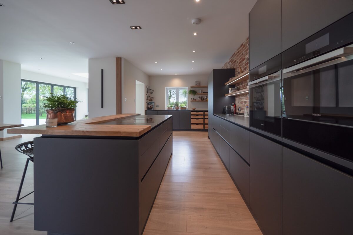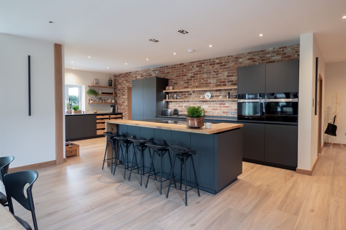 A bold and beautifully balanced kitchen, designed for a customer who wanted a space with a strong modern-industrial identity. The exposed brick wall sets the tone, bringing warmth and texture, while the smooth matt Acrylic Granite Grey cabinetry from the EWE Fina range introduces sleekness and depth.