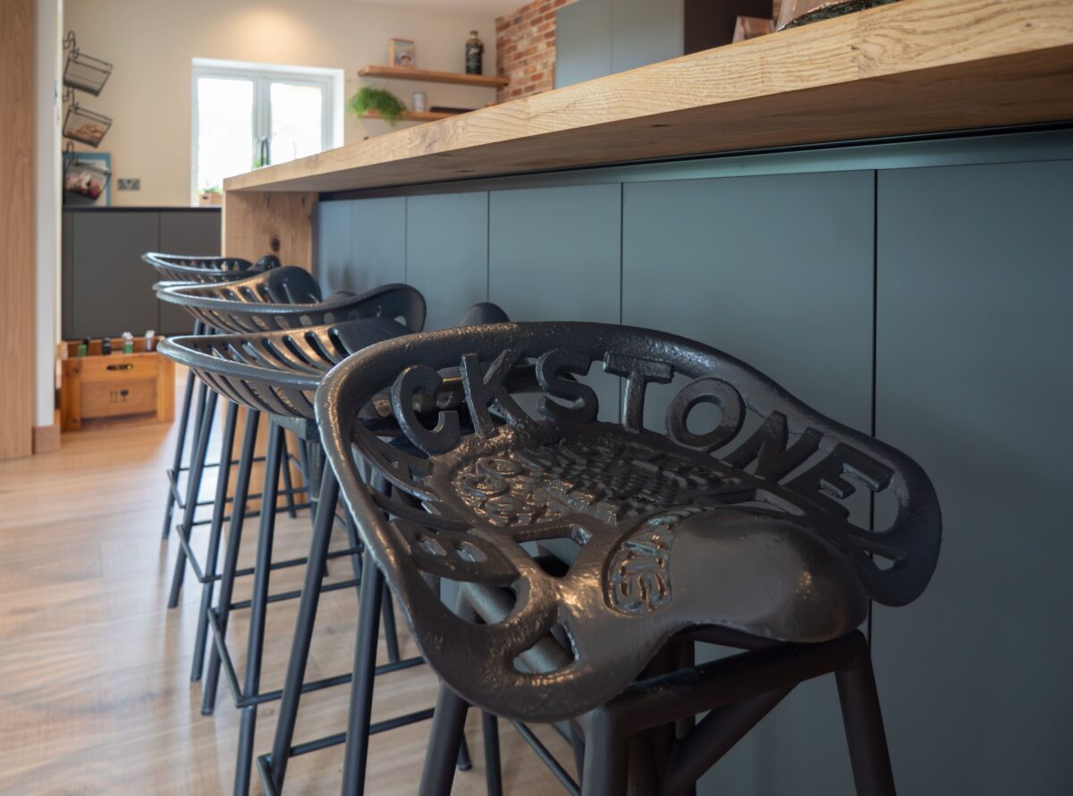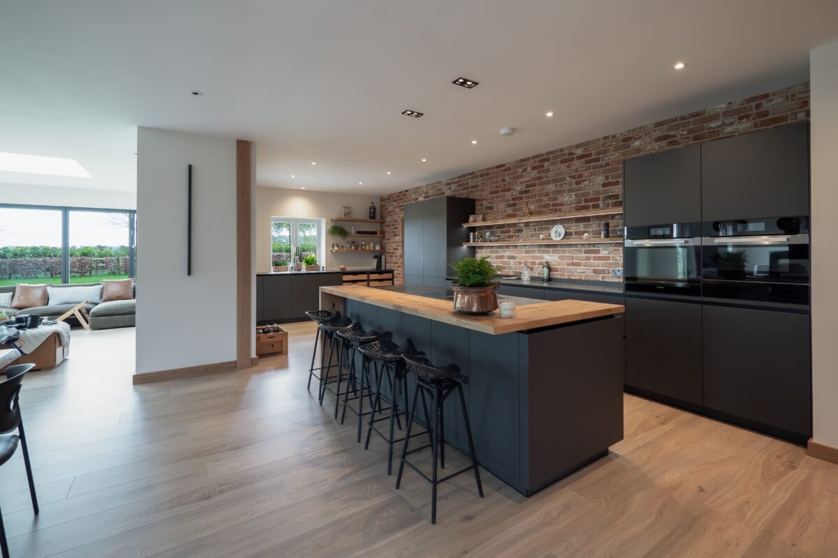 The designer paired this with striking Neolith Layla Riverwashed worktops, chosen for their tactile finish and durability, and Miele appliances for premium performance. Open timber shelving softens the overall look, while the black feature stools and bespoke steel worktop support give the island its sculptural, functional edge. This space is the perfect mix of contemporary precision and raw, industrial charm.