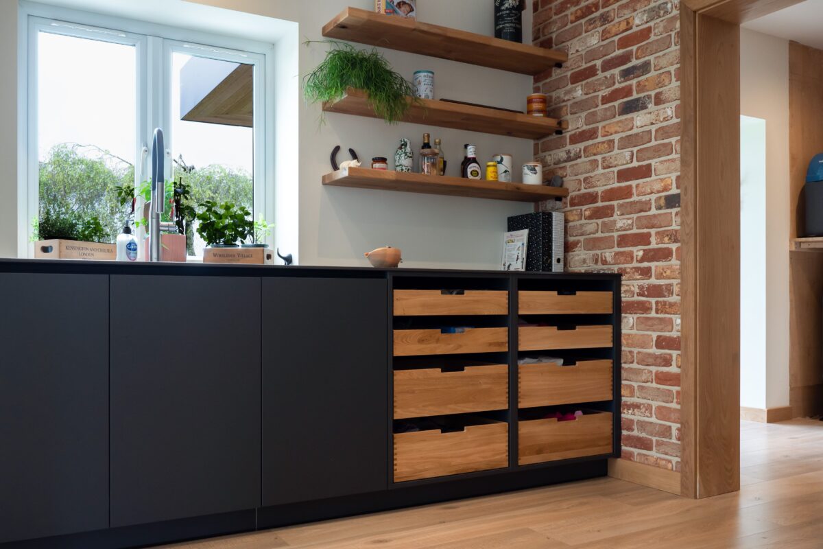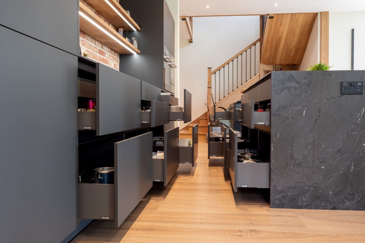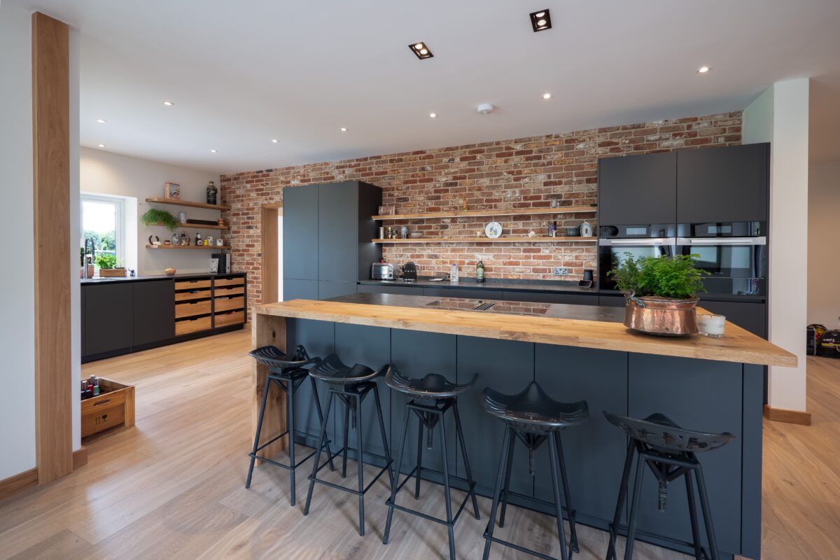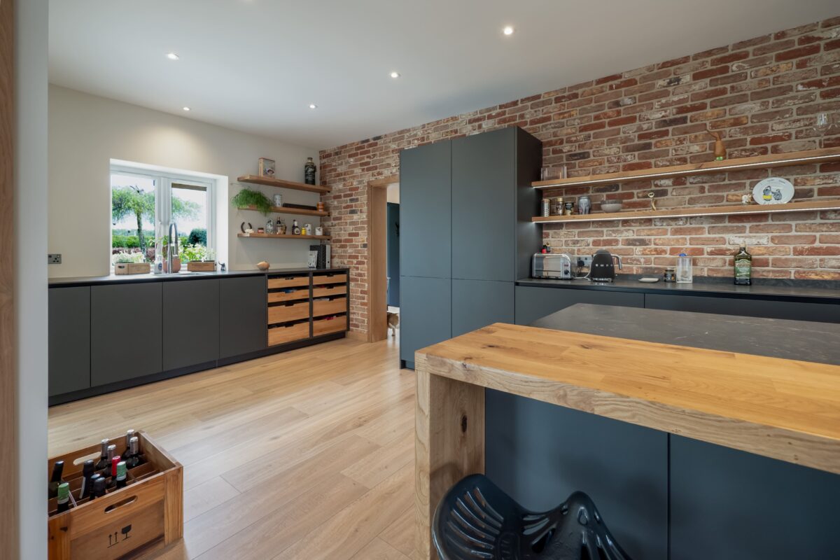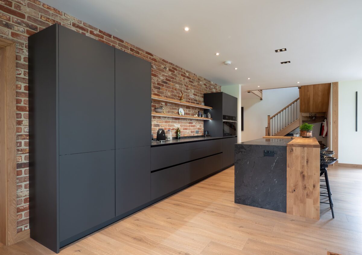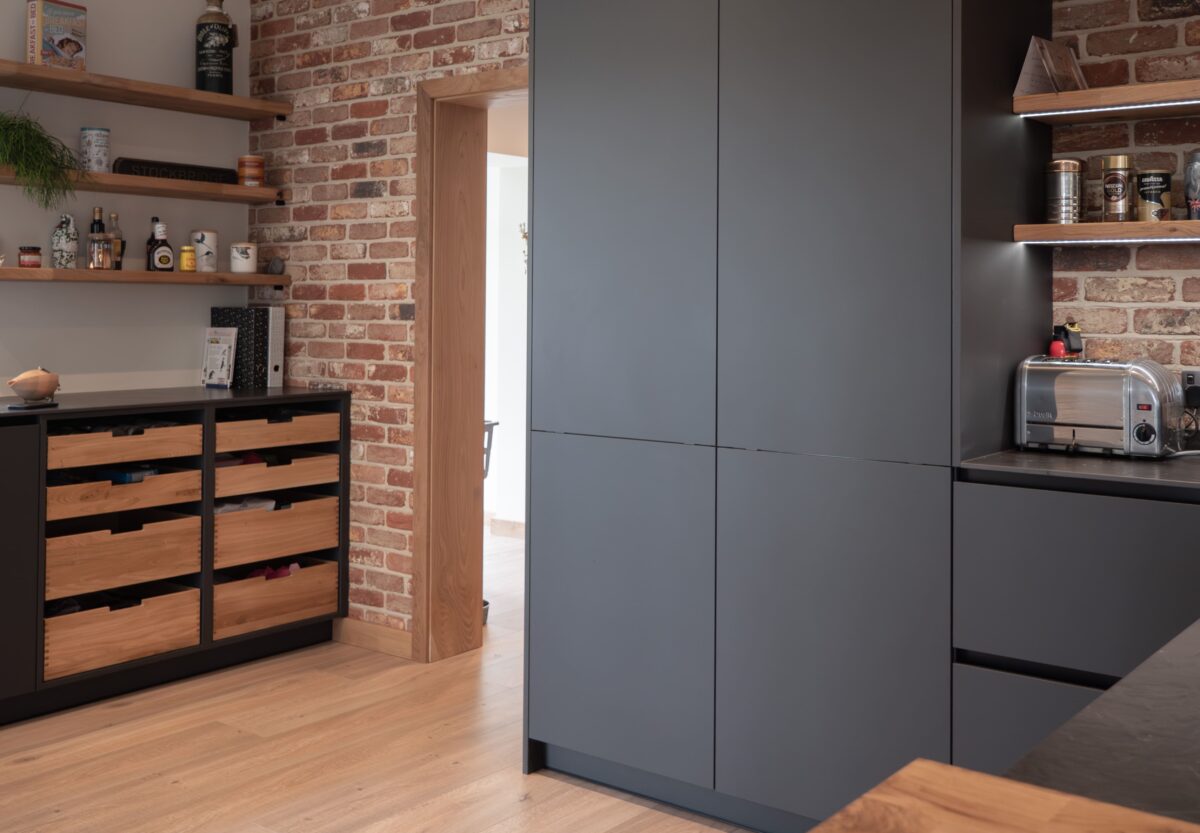 “This kitchen was all about bringing together industrial textures with clean, modern design. The exposed brick was the anchor, so we kept the cabinetry sleek with the EWE Fina range in Granite Grey and introduced subtle contrast through the Riverwashed Neolith worktops and steel support detailing. The result is a space with real character and lasting function.”